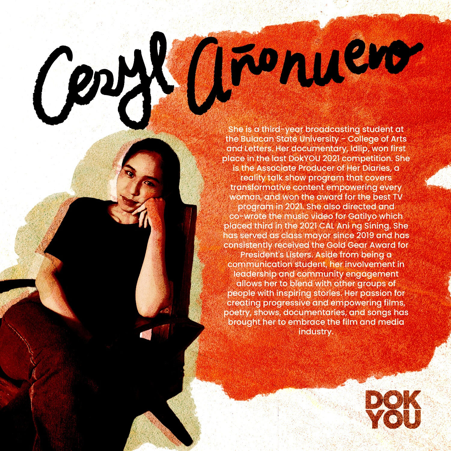 Hi, I am Ceryl AƱonuevo, a graduate of Bachelor of Arts in Broadcasting based in Malolos Bulacan, Philippines. Throughout my academic years, I've already produced stories, films, music videos, and content for TV & radio shows. I also create content for digital marketing, events, and organizational materials. My passion for creating progressive and empowering films, poetry, shows, documentaries, and songs has brought me to embrace the film and media industry. Aside from being a communication student, my involvement in leadership and community engagement allows me to blend with other groups of people with inspiring stories.